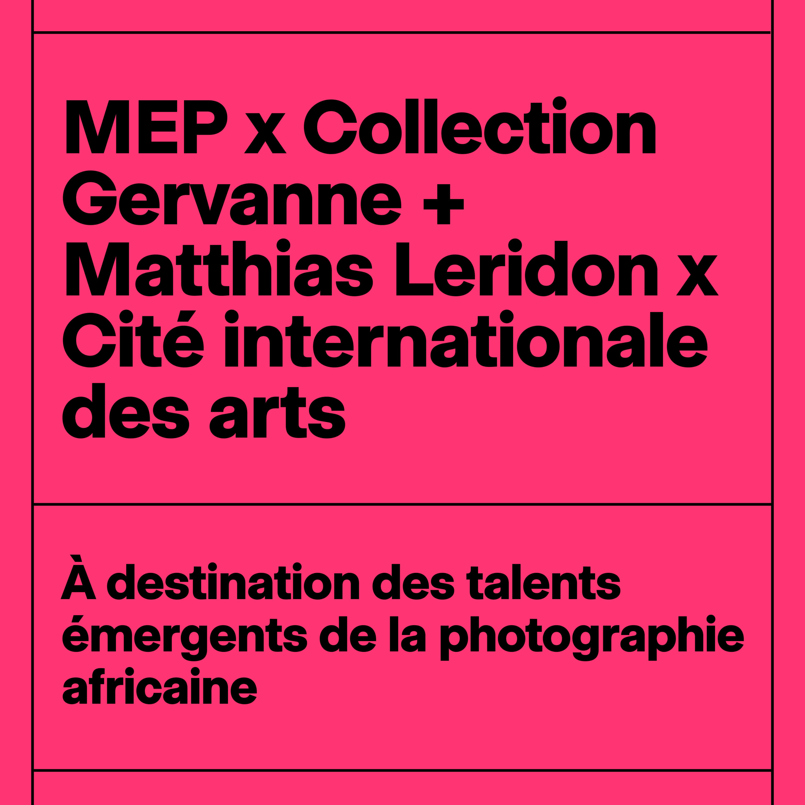 Created by Gervanne and Matthias Leridon in collaboration with the MEP and the Cité internationale des arts, the MEP – Collection Gervanne + Matthias Leridon Collection – Cité internationale des arts Residency programme is destined for emerging artists and dedicated to African photography.