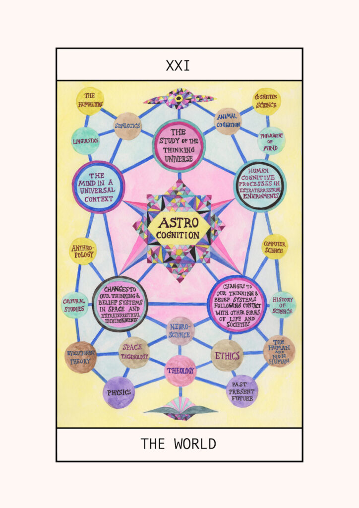 Suzanne Treister, HEXEN 5.0/Tarot/XXI The World - Astrocognition, 2023-24 Acquarelle sur papier, 42 x 29.7 cm Avec l’aimable autorisation de l’artiste, Annely Juda Fine Art, London et P.P.O.W. Gallery, New York