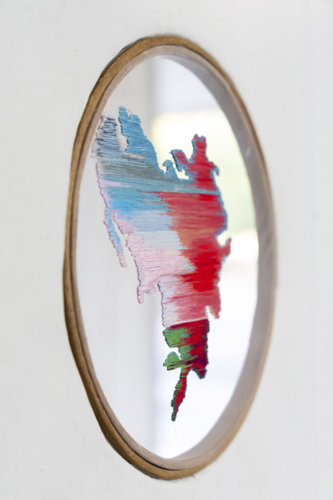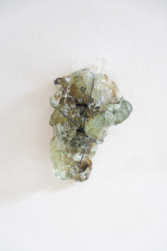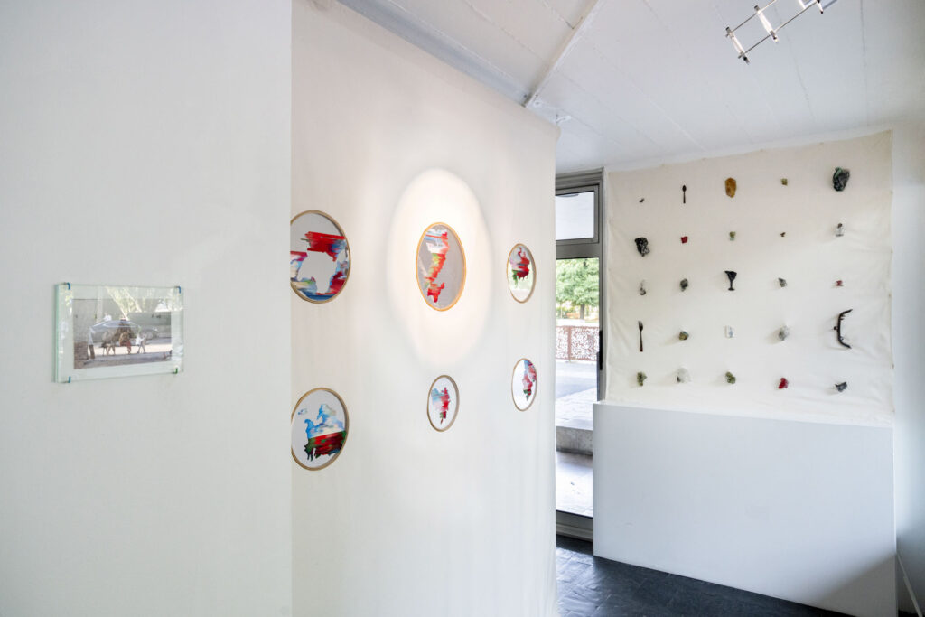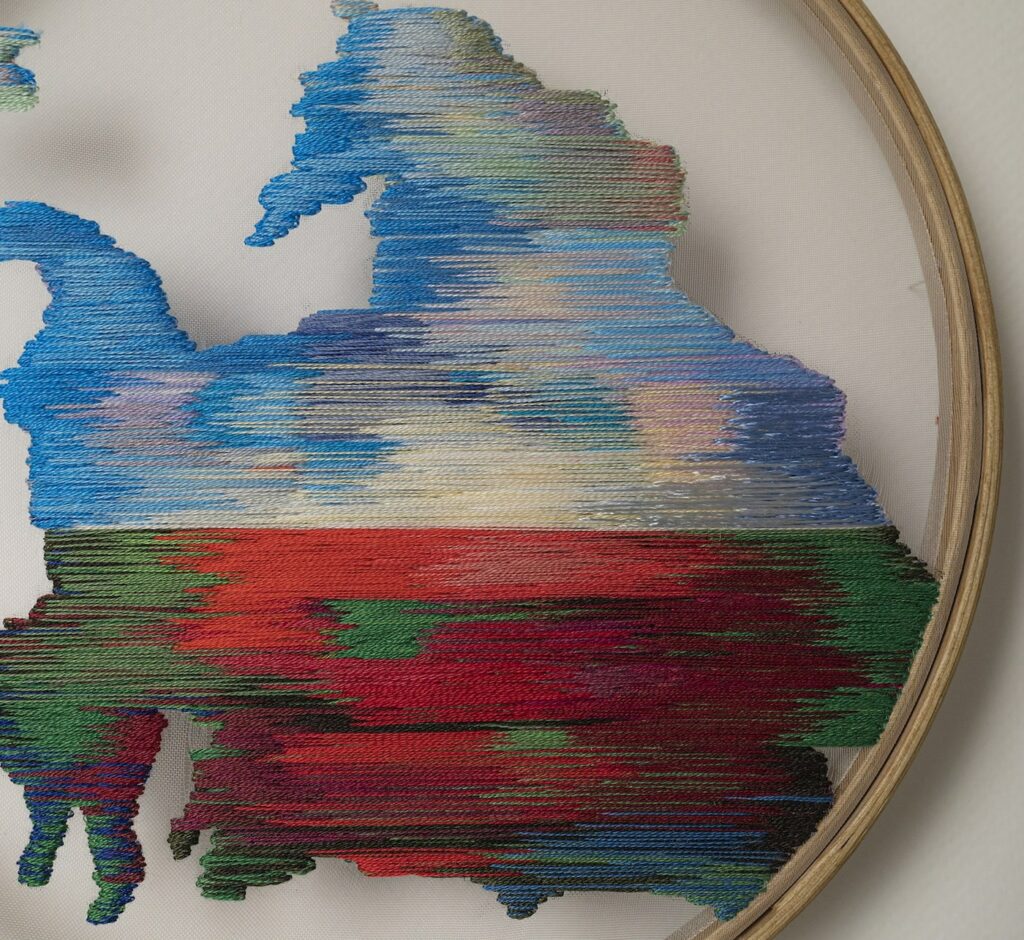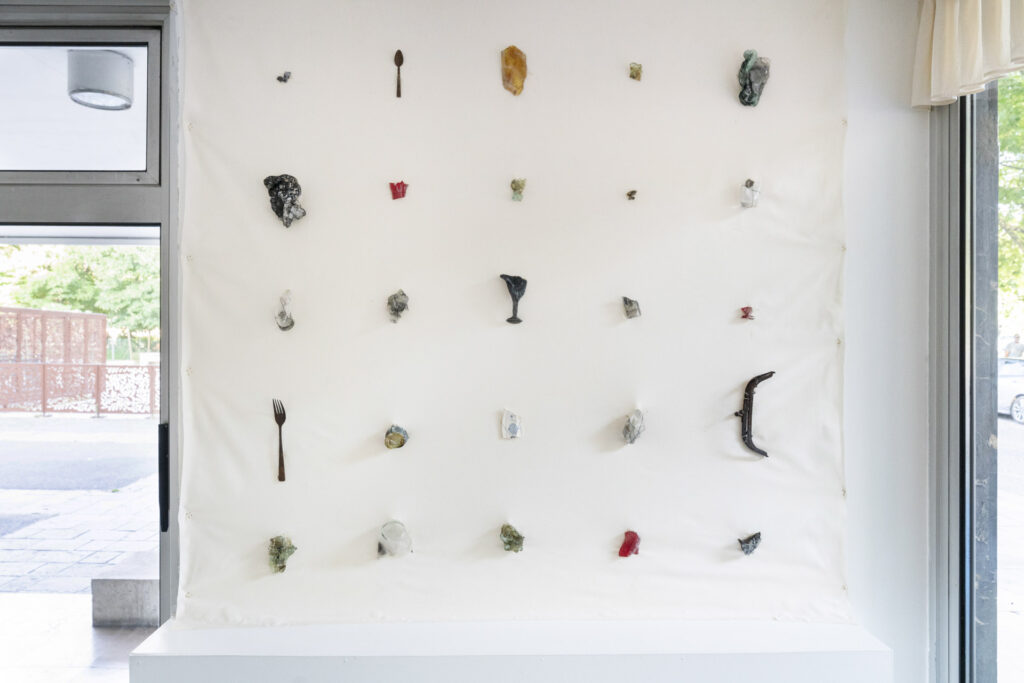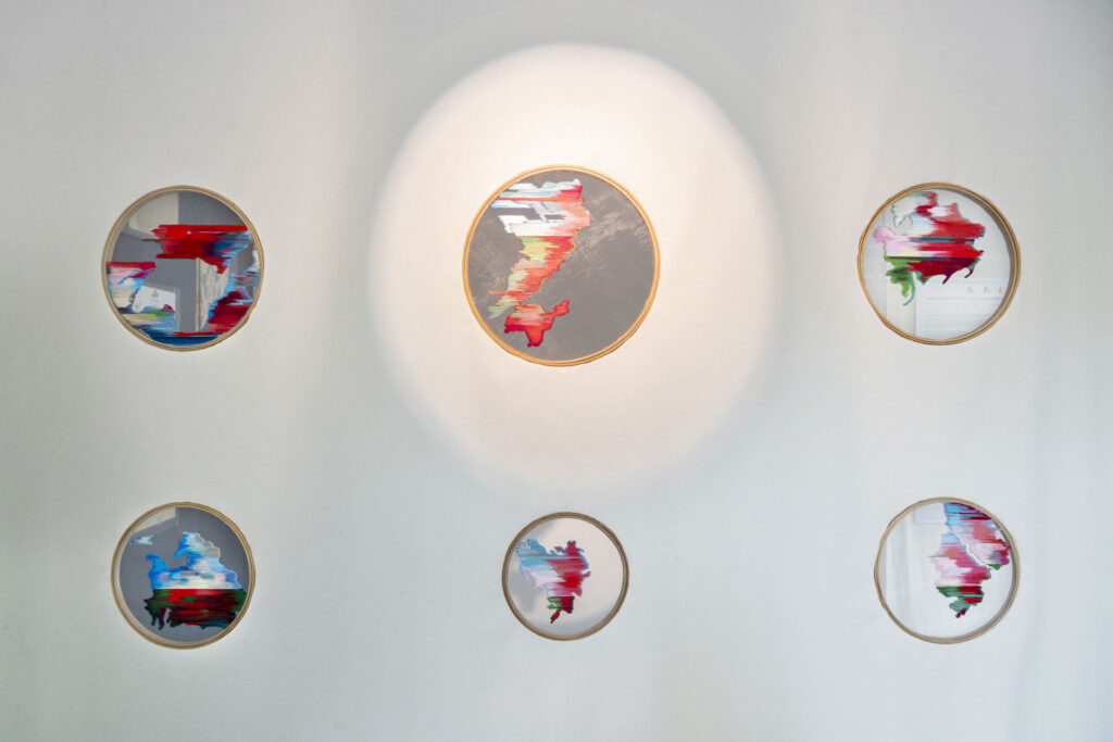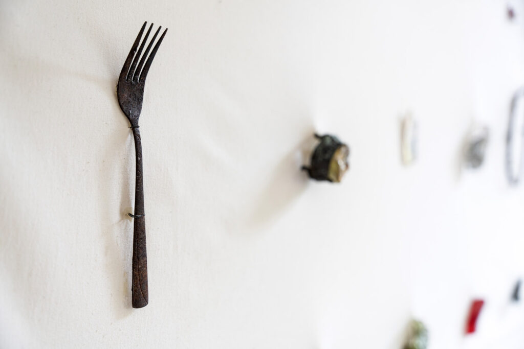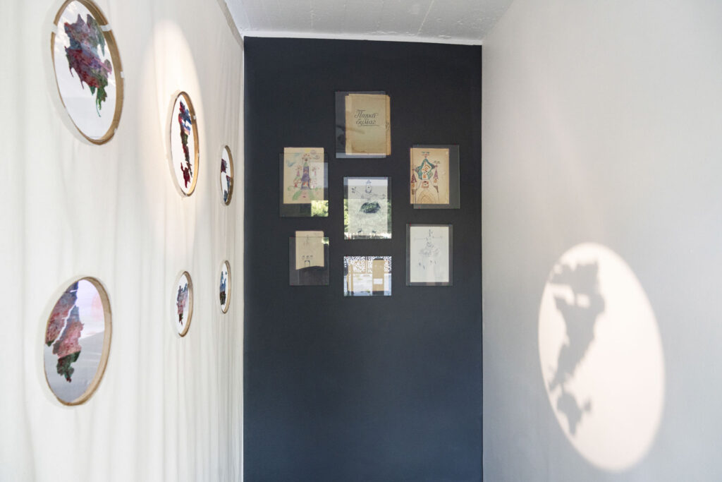 The archive comprises three types of objects: textile embroideries mapping Ukraine’s territorial losses; kitchen utensils melted by a Russian missile strike; and childhood drawings by the artist, retrieved from her family flat in Kyiv, where she was raised.