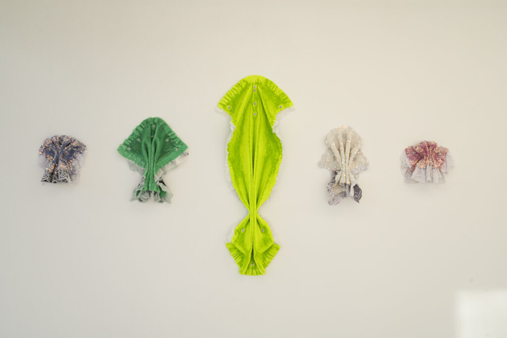 Also on view is an ongoing series of sculptural ornaments, in which sequins are ‘welded’ into shape using a steam iron, expanding his investigation into surface and structure.
