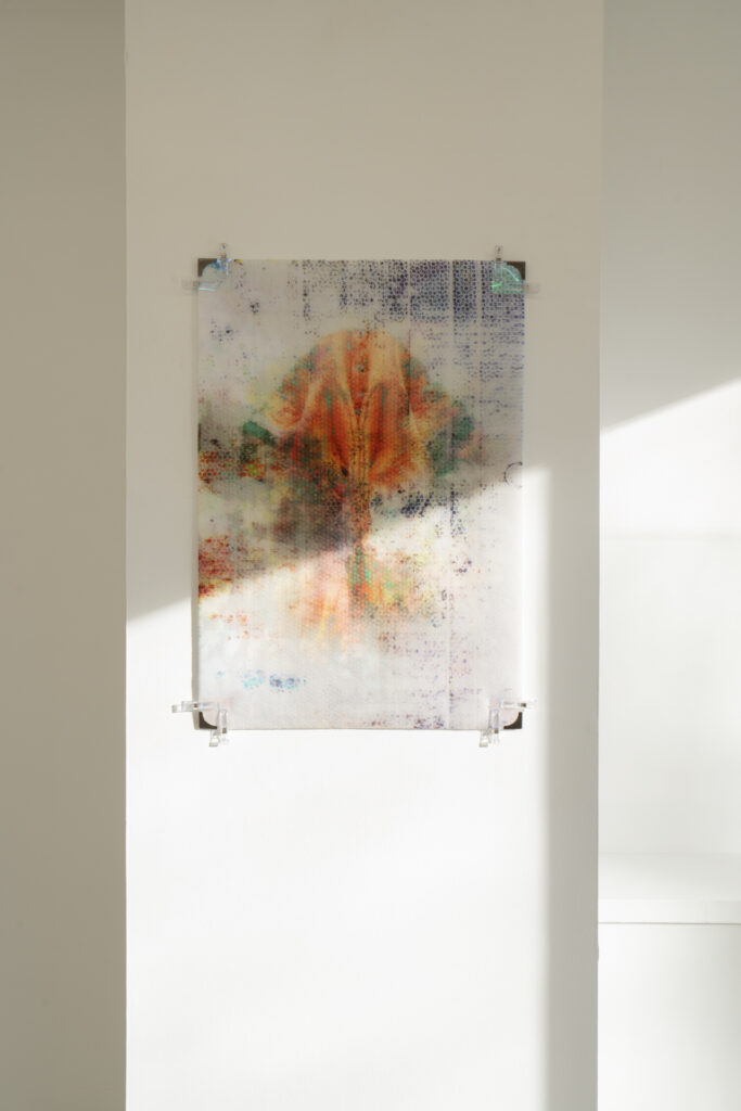 For this exhibition, he presents a selection of recent works. Using a technique that can be described as a ‘digital quilt,’ images are printed directly onto wadding—typically the middle layer of quilts—blurring the boundaries between photography, textile, and painting. Abstracted architectural and natural motifs, including Batlak’s own textile compositions, are fused into the porous, absorbent material, further dissolving their forms.