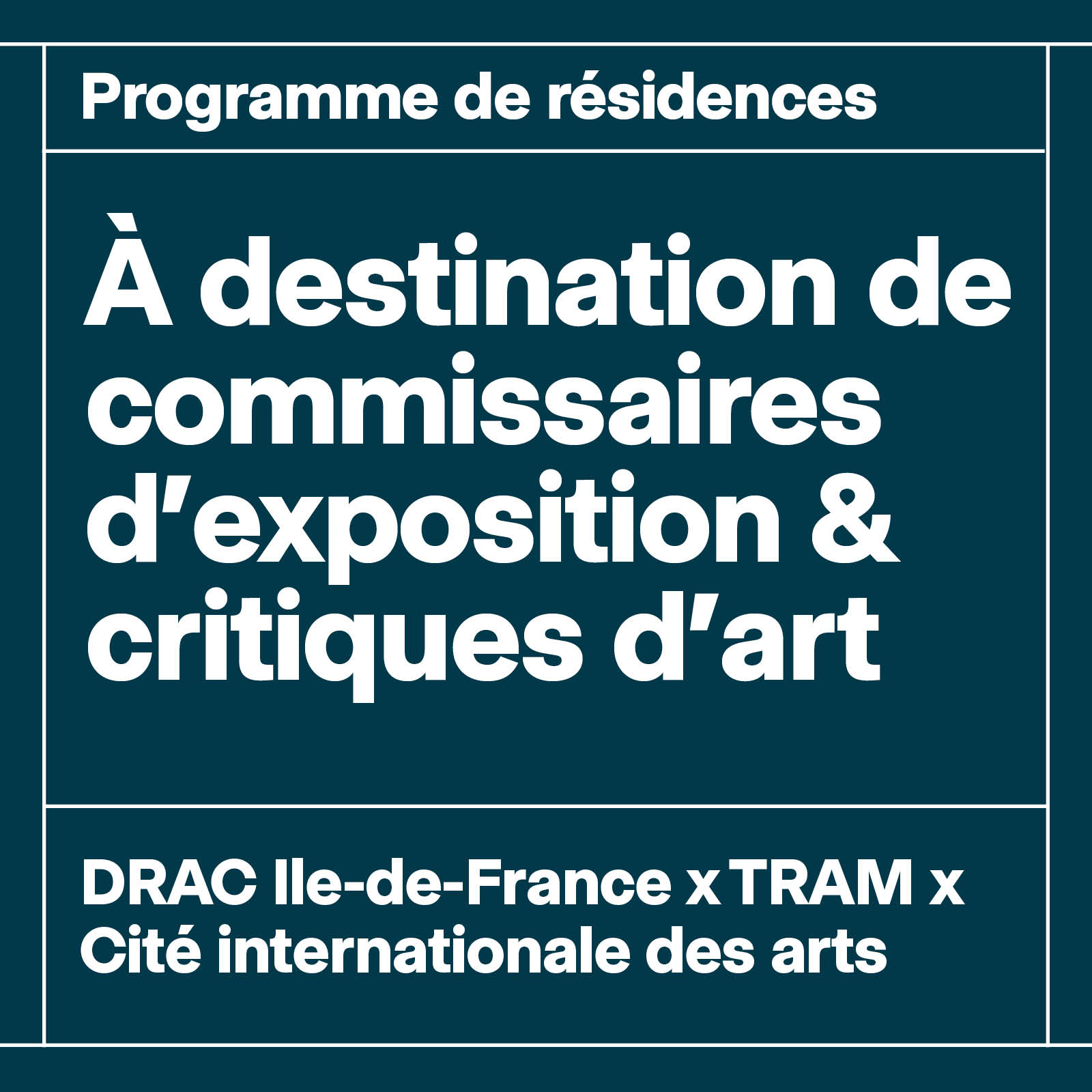 La DRAC Île-de-France, le réseau TRAM et la Cité internationale des arts ont co-construit un programme de résidence de recherche à destination de commissaires d’exposition ou critiques d’art, travaillant et résidant en Union européenne. L’objectif de ce programme est d’encourager et de faciliter leur mobilité en soutenant les possibilités de rencontres avec la scène artistique et curatoriale française, tout en accompagnant des projets centrés sur une recherche qui pourront se nourrir de l’environnement de travail proposé par la Cité internationale des arts.