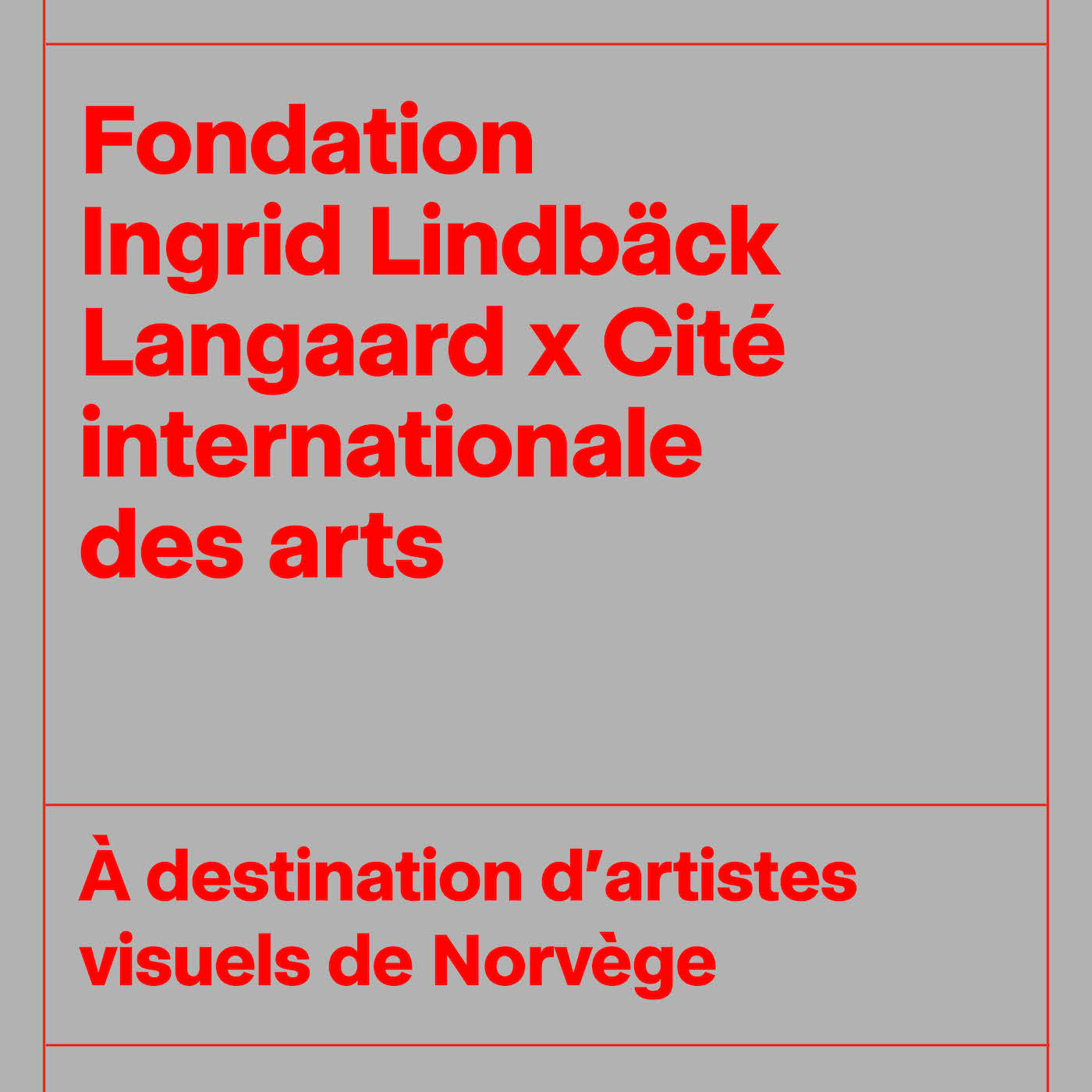 Le programme Fondation Ingrid Lindbäck Langaard x Cité internationale des arts permet à des artistes de Norvège d’être accueillis en résidence à la Cité pour une période de 3 à 6 mois ou plus. Chaque année, entre 8 et 12 artistes dont les pratiques s’inscrivent dans les domaines des arts visuels (peinture, sculpture, installation, cinéma, vidéo etc) sont sélectionnés.