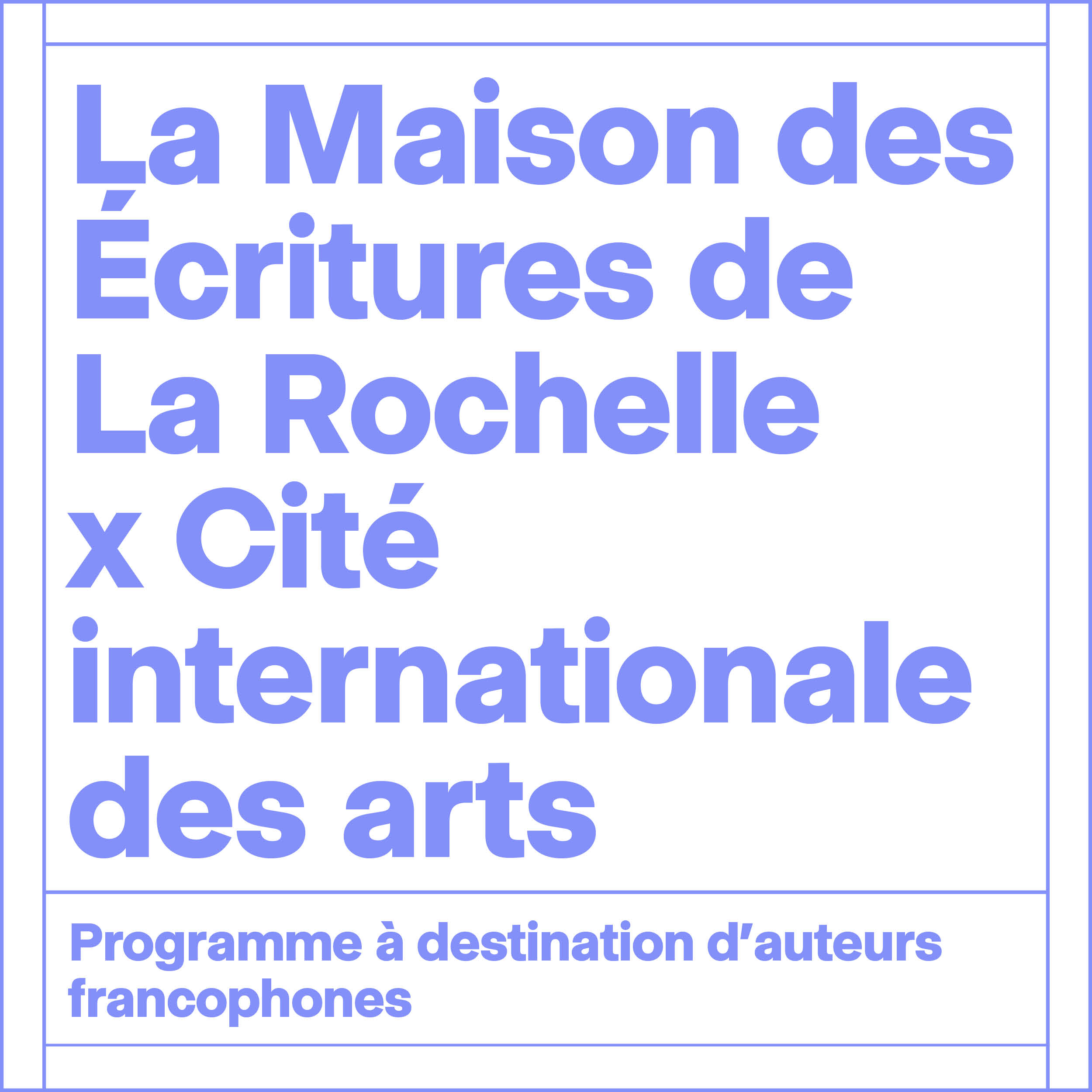 La Maison des écritures de la Rochelle et la Cité internationale des arts portent un programme de résidences croisé, à destination d’auteurs francophones. L’objectif de ce programme est de permettre aux auteurs de bénéficier de 2 mois de résidence et d’immersion au sein des environnements proposés par chacun des partenaires pour développer un projet d’écriture en lien avec les publics locaux.