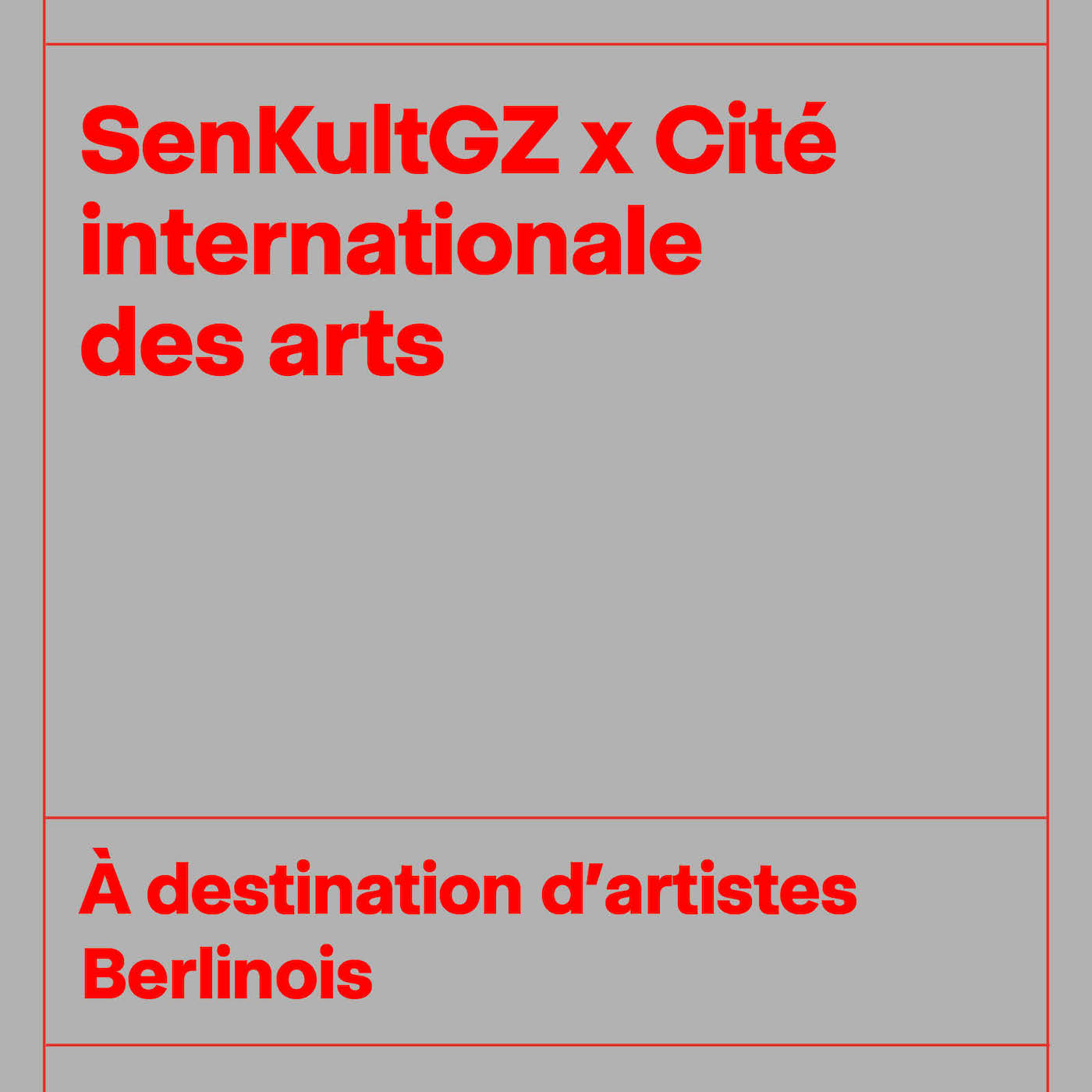 Le programme SenKultGZ x Cité internationale des arts propose 4 résidences de 6 mois par an à des artistes berlinois. Il s’adresse aux musiciens ou compositeurs, aux artistes dont les pratiques s’inscrivent dans les domaines des arts visuels, de la littérature, de la bande dessinée et de la danse et leur permet d’intégrer la communauté des artistes de la Cité des internationale des arts.